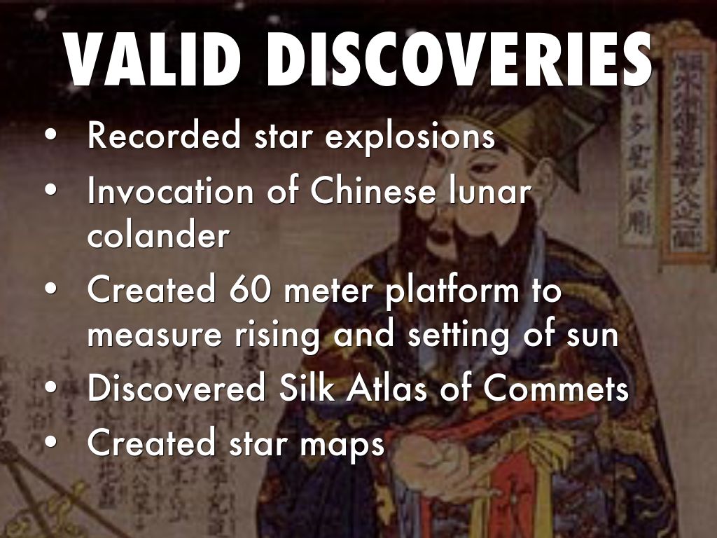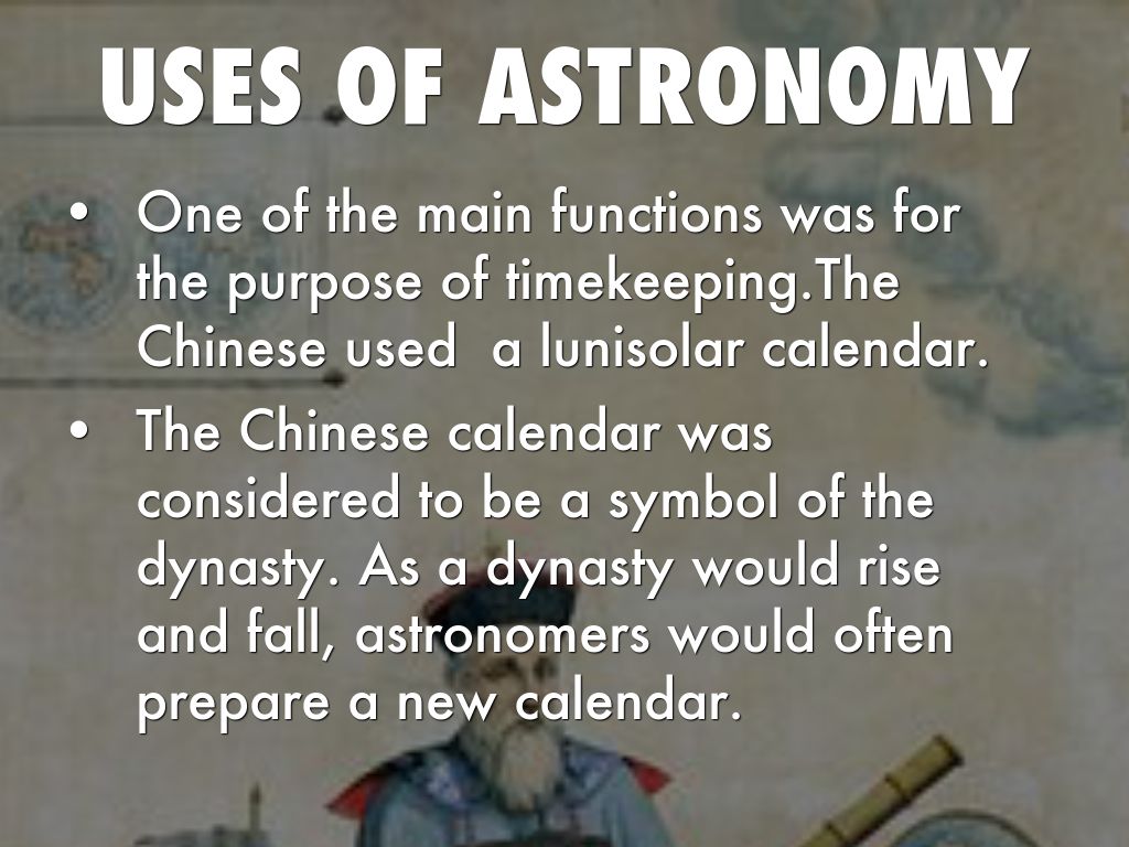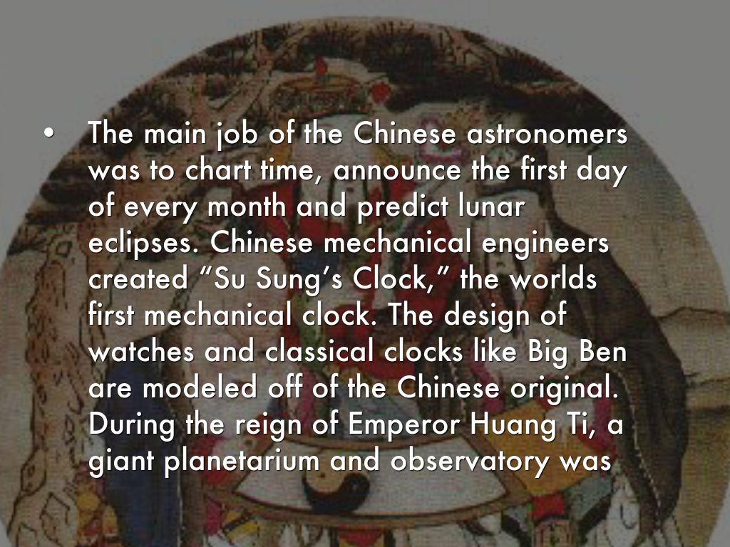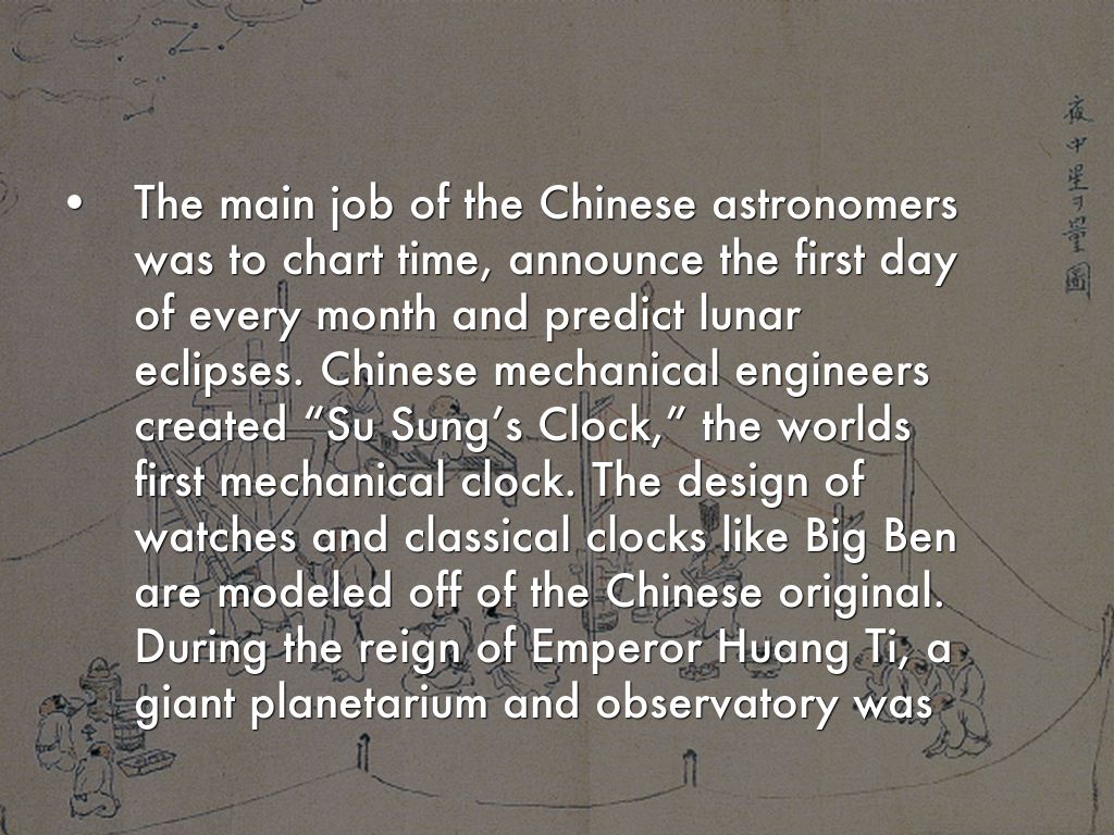 The main job of the Chinese astronomers was to chart time, announce the first day of every month and predict lunar eclipses. Chinese mechanical engineers created “Su Sung’s Clock,” the worlds first mechanical clock. The design of watches and classical clocks like Big Ben are modeled off of the Chinese original. During the reign of Emperor Huang Ti, a giant planetarium and observatory was built to study comets, sunspots, and solar flares. The Chinese were the first to record these phenomena which we are still observing (in much more advanced facilities) today.