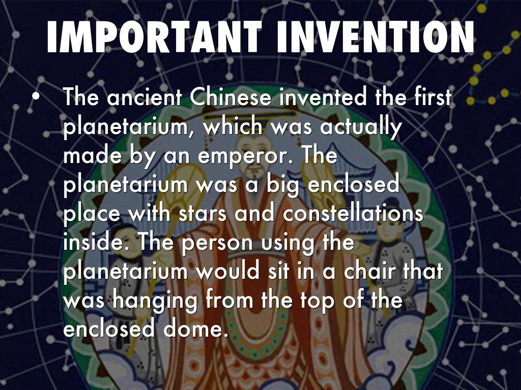 The ancient Chinese invented the first planetarium, which was actually made by an emperor. The planetarium was a big enclosed place with stars and constellations inside. The person using the planetarium would sit in a chair that was hanging from the top of the enclosed dome.