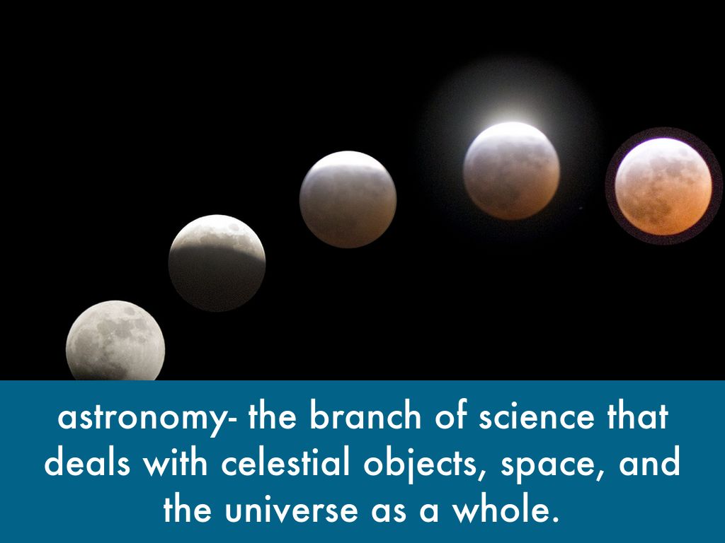 astronomy- the branch of science that deals with celestial objects, space, and the universe as a whole.