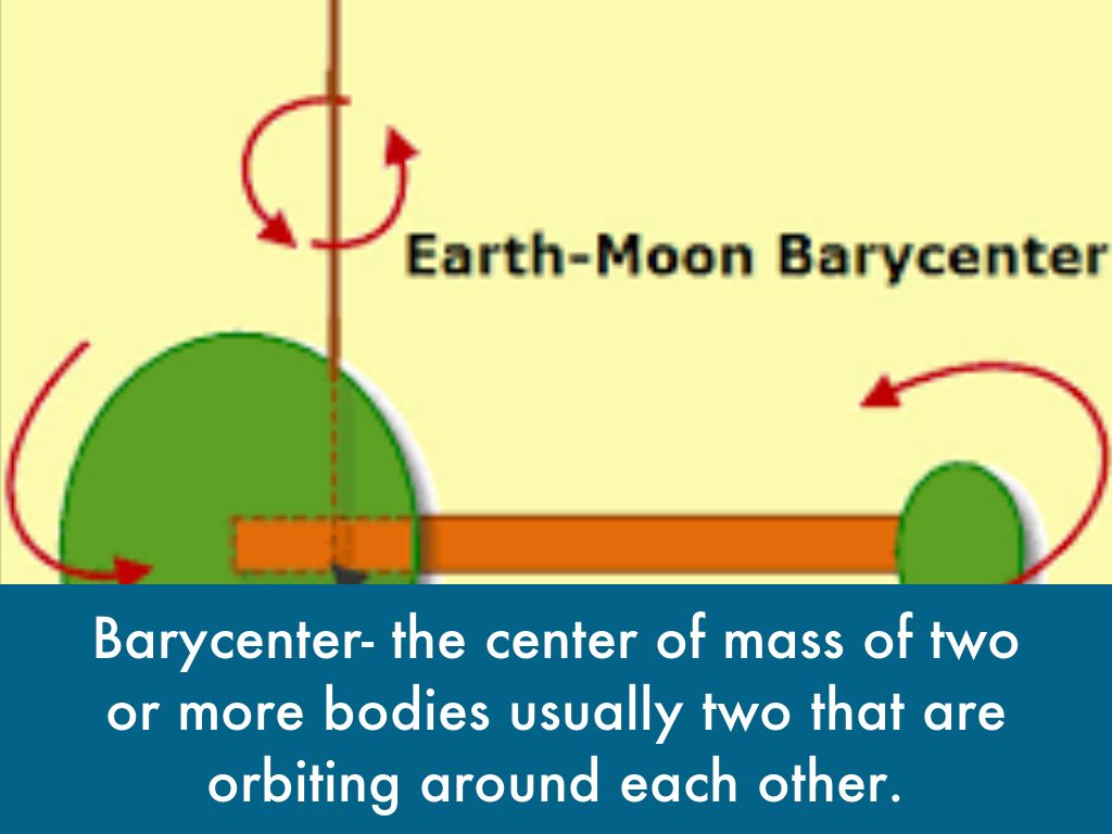 Barycenter- the center of mass of two or more bodies usually two that are orbiting around each other.