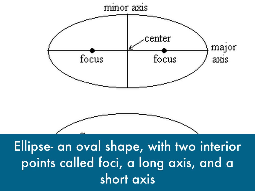 Ellipse- an oval shape, with two interior points called foci, a long axis, and a short axis