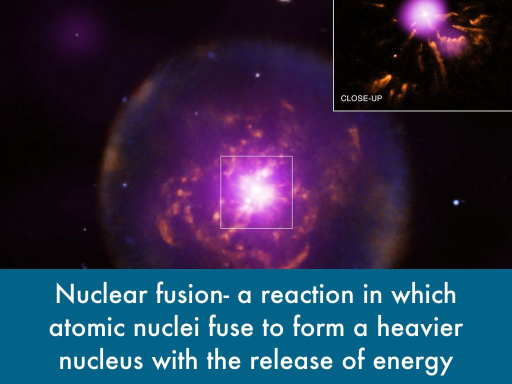 Nuclear fusion- a reaction in which atomic nuclei fuse to form a heavier nucleus with the release of energy