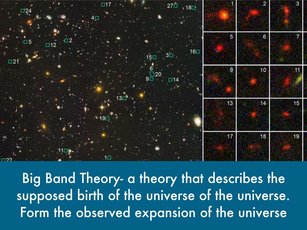 Big Band Theory- a theory that describes the supposed birth of the universe of the universe. Form the observed expansion of the universe