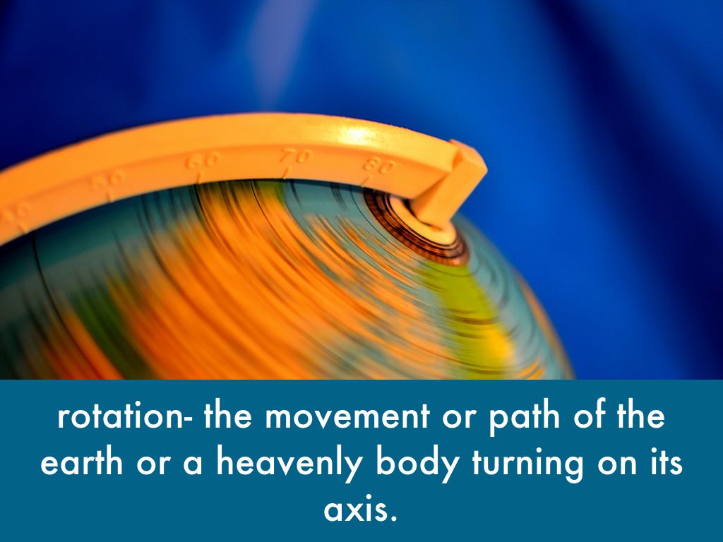 rotation- the movement or path of the earth or a heavenly body turning on its axis.