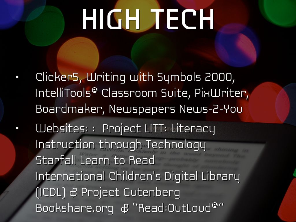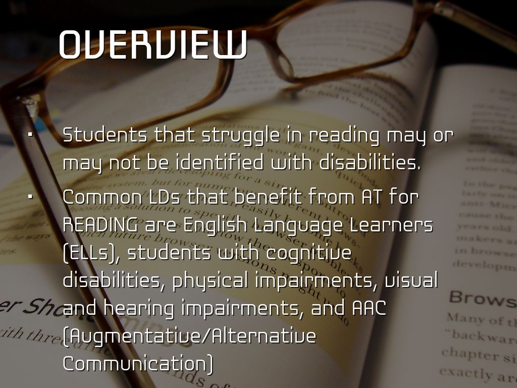 Common LDs that benefit from AT for READING are English Language Learners (ELLs), students with cognitive disabilities, physical impairments, visual and hearing impairments, and AAC (Augmentative/Alternative Communication)