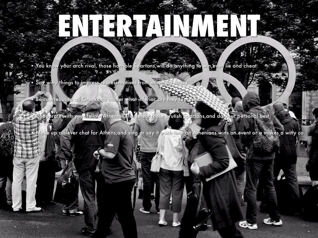 Make up a clever chat for Athens,and sing or say it each time an Athenians wins an event or a makes a witty comment.