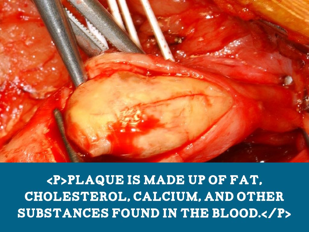 Plaque is made up of fat, cholesterol, calcium, and other substances found in the blood.