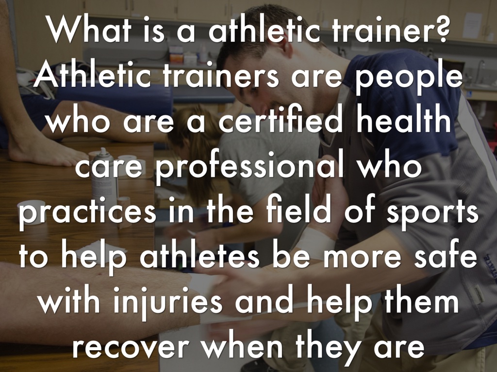 What is a athletic trainer? Athletic trainers are people who are a certified health care professional who practices in the field of sports to help athletes be more safe with injuries and help them recover when they are