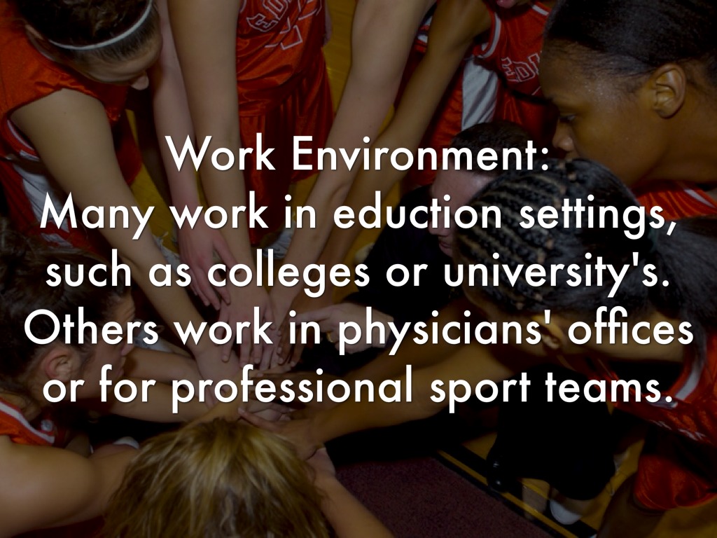 Many work in eduction settings, such as colleges or university's. Others work in physicians' offices or for professional sport teams.