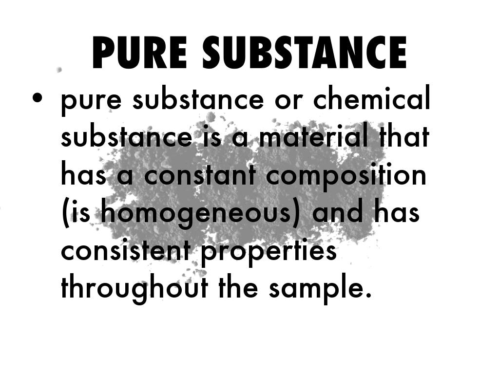 pure substance or chemical substance is a material that has a constant composition (is homogeneous) and has consistent properties throughout the sample.
