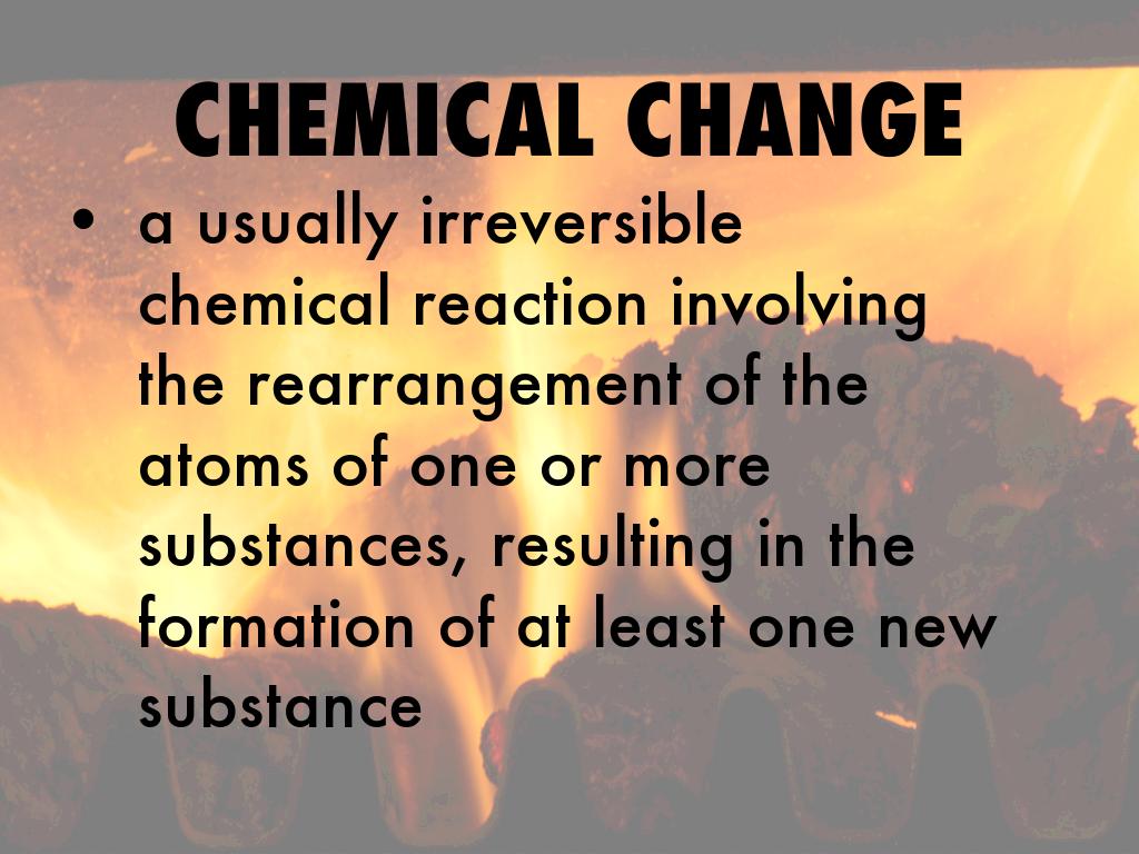 a usually irreversible chemical reaction involving the rearrangement of the atoms of one or more substances, resulting in the formation of at least one new substance