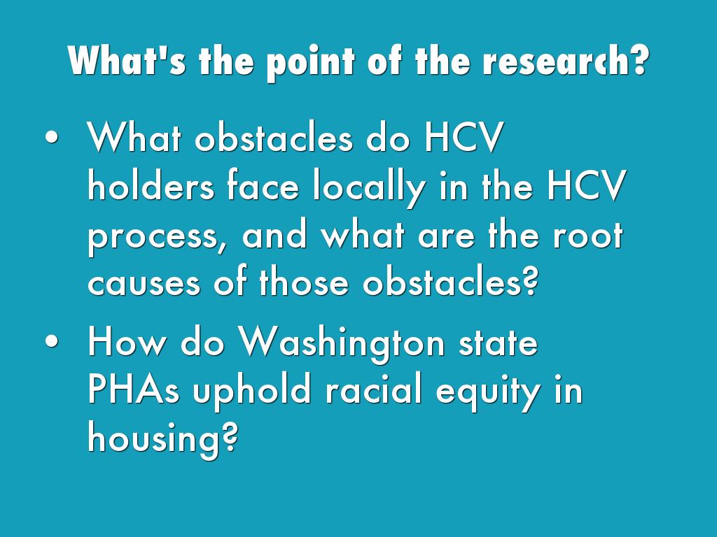 This is why we need to find out what obstacles that HCV holders face locally (in Thurston and King Counties) in the HCV process, and what the root causes of those obstacles might be.