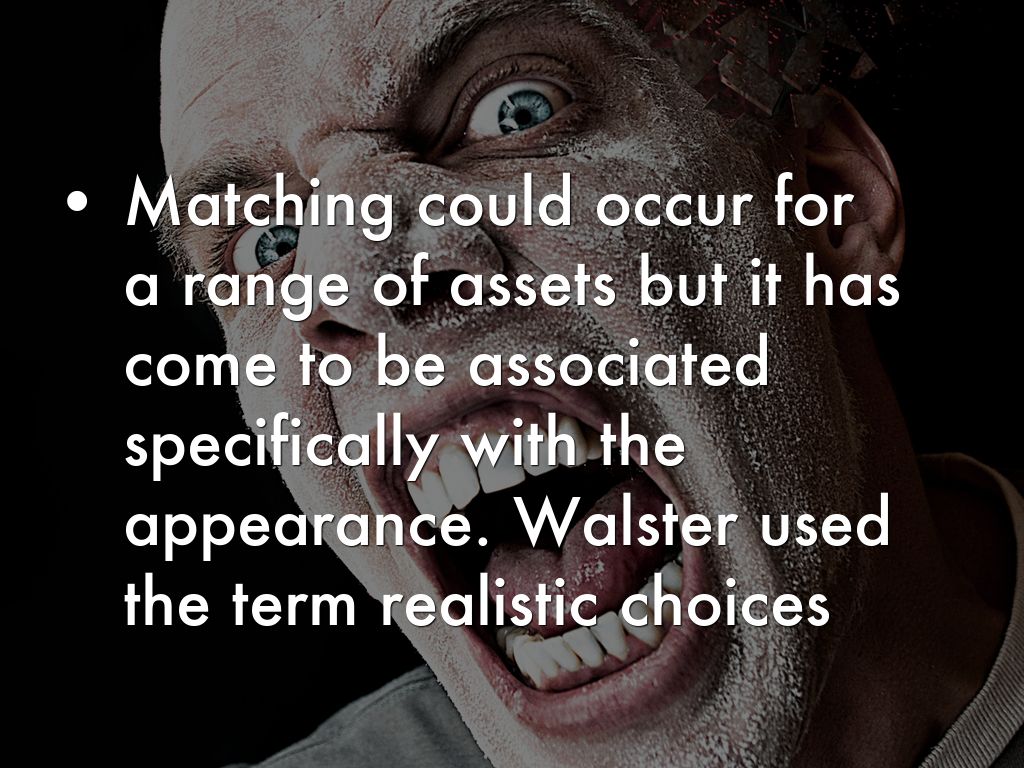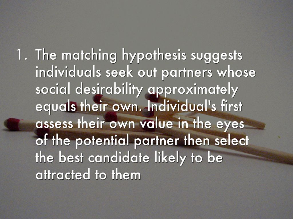 The matching hypothesis suggests individuals seek out partners whose social desirability approximately equals their own. Individual's first assess their own value in the eyes of the potential partner then select the best candidate likely to be attracted to them