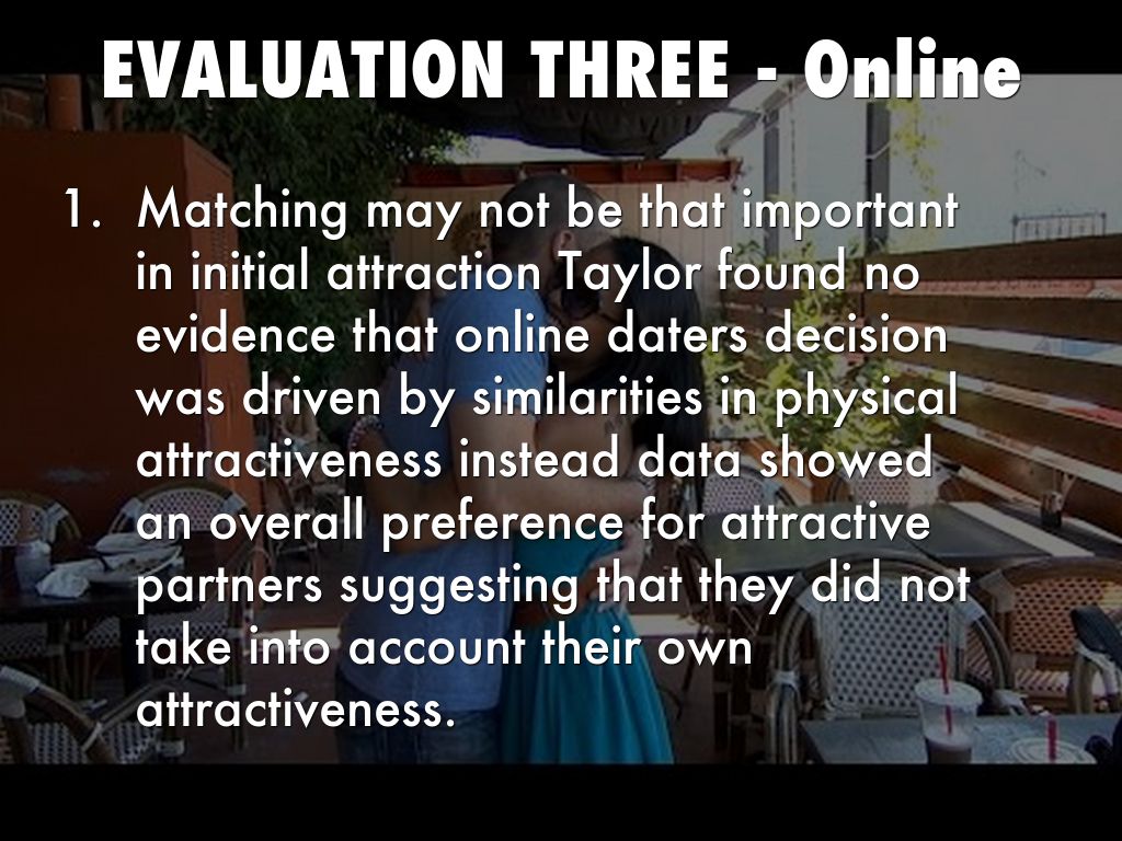 Matching may not be that important in initial attraction Taylor found no evidence that online daters decision was driven by similarities in physical attractiveness instead data showed an overall preference for attractive partners suggesting that they did not take into account their own attractiveness.