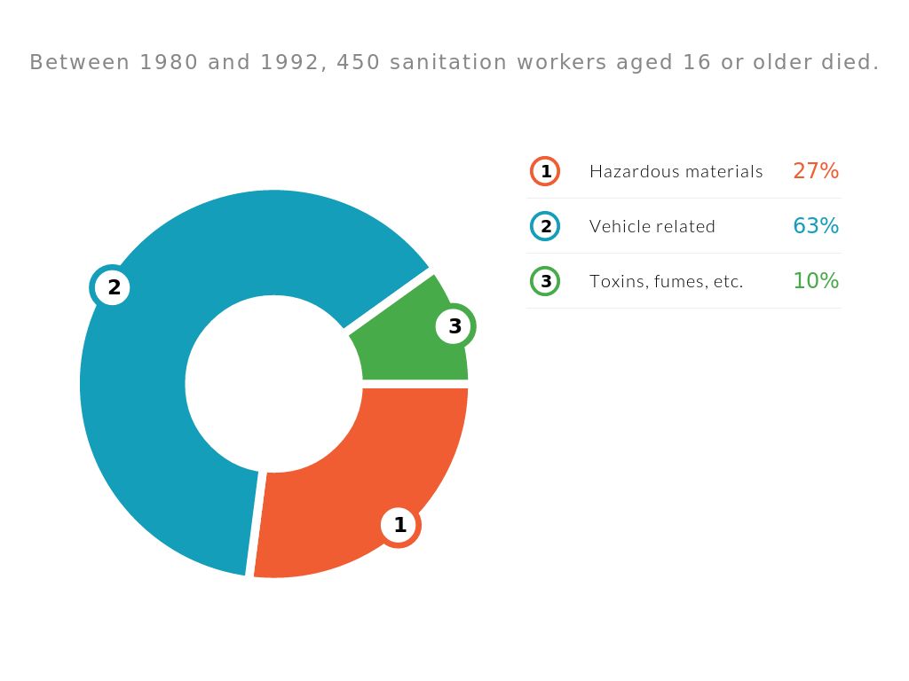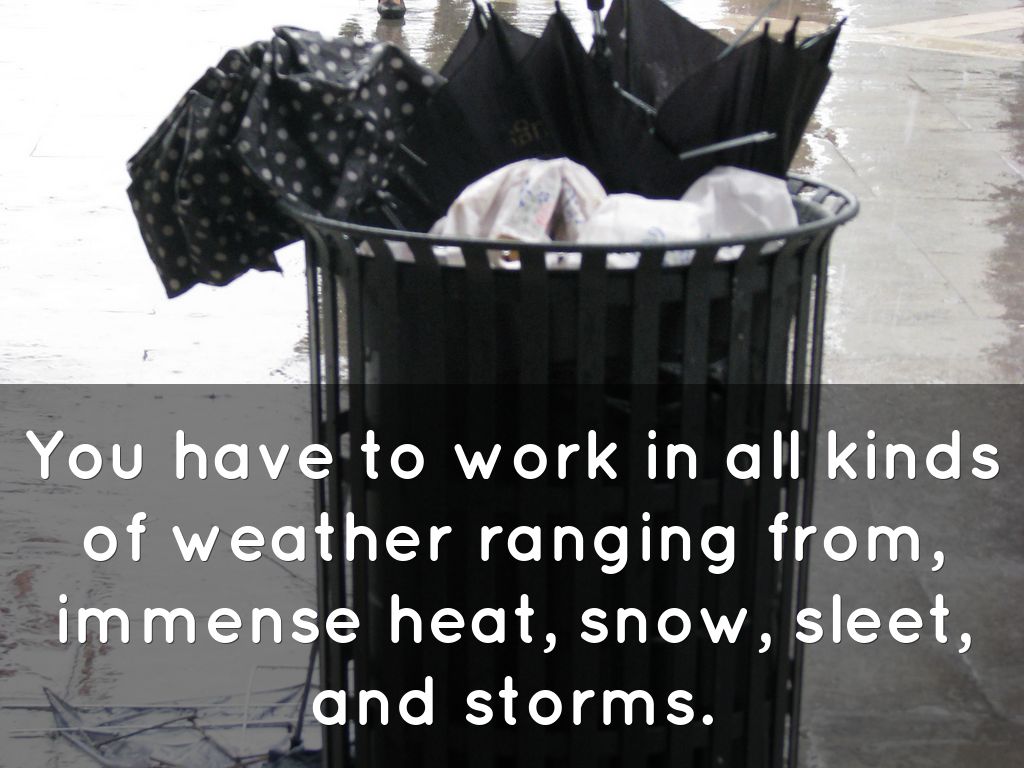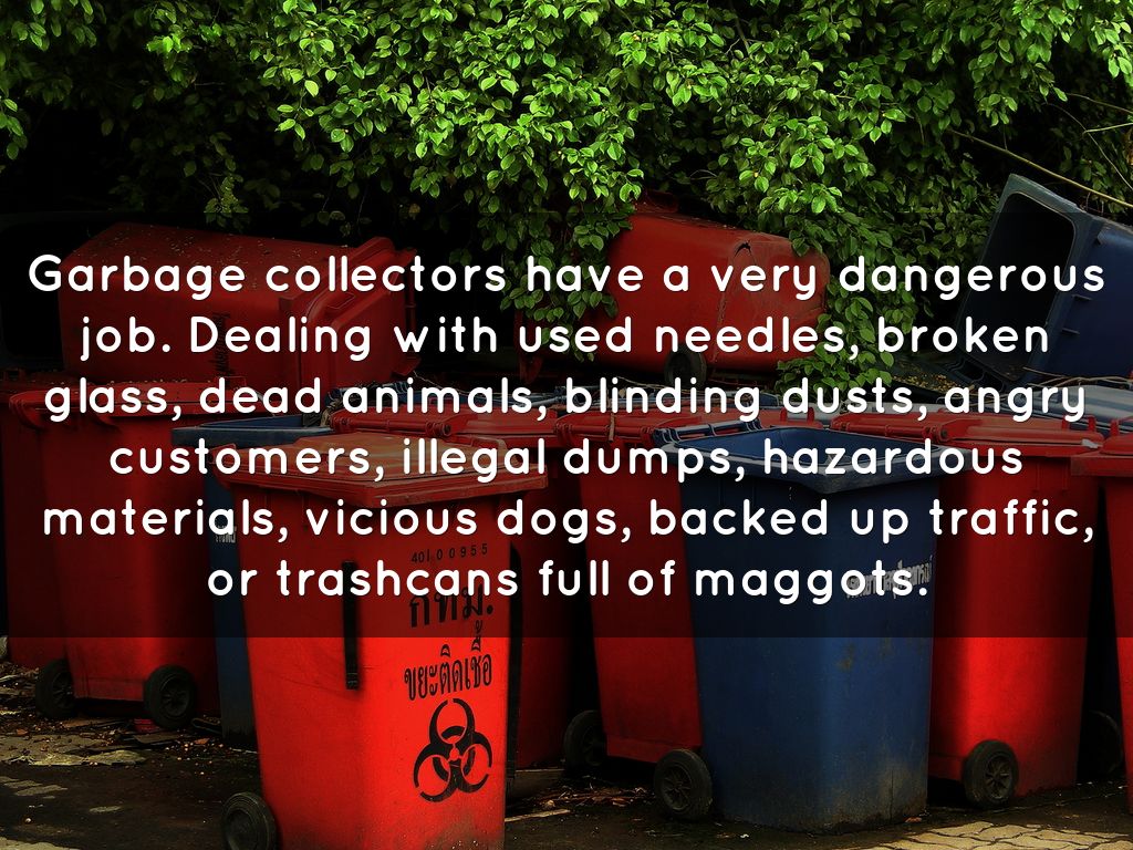 Garbage collectors have a very dangerous job. Dealing with used needles, broken glass, dead animals, blinding dusts, angry customers, illegal dumps, hazardous materials, vicious dogs, backed up traffic, or trashcans full of maggots.