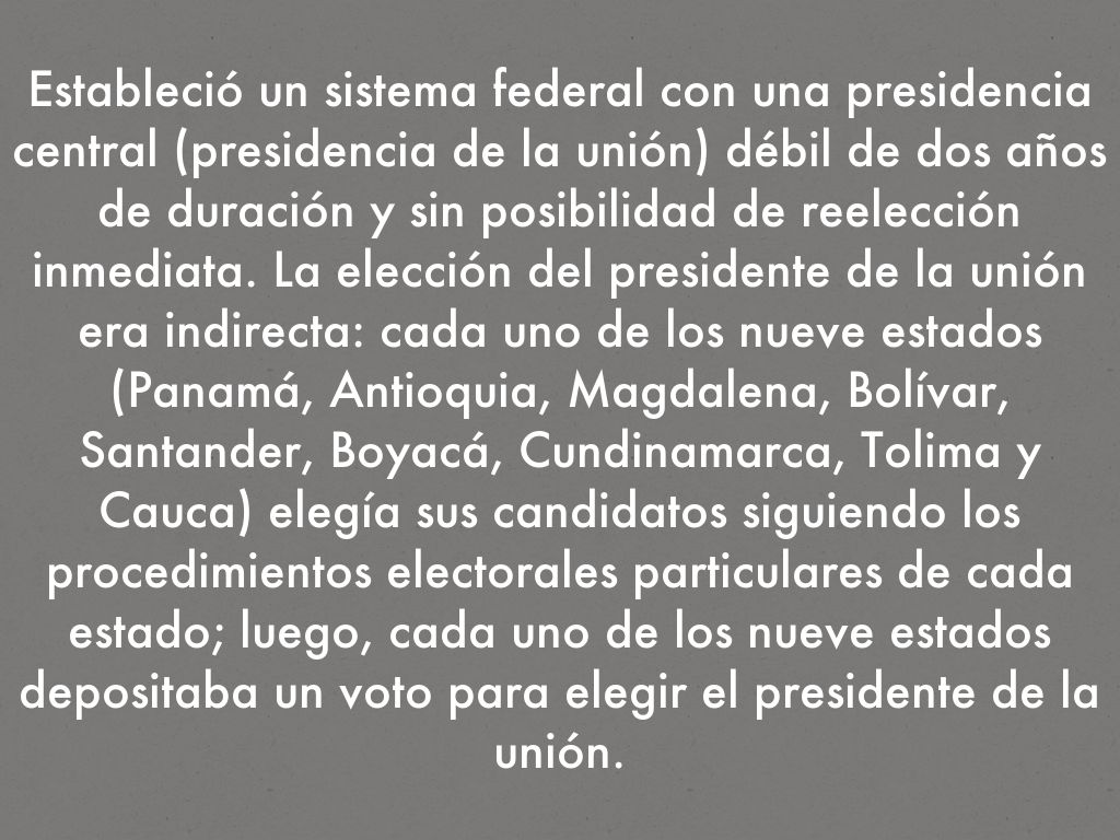 Estableció un sistema federal con una presidencia central (presidencia de la unión) débil de dos años de duración y sin posibilidad de reelección inmediata. La elección del presidente de la unión era indirecta: cada uno de los nueve estados (Panamá, Antioquia, Magdalena, Bolívar, Santander, Boyacá, Cundinamarca, Tolima y Cauca) elegía sus candidatos siguiendo los procedimientos electorales particulares de cada estado; luego, cada uno de los nueve estados depositaba un voto para elegir el presidente de la unión.