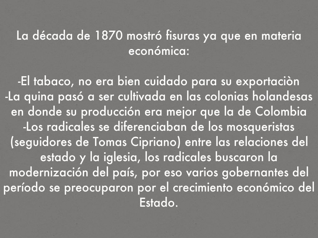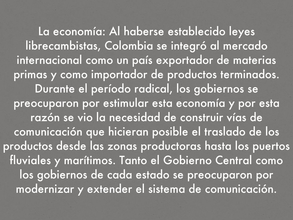 La economía: Al haberse establecido leyes librecambistas, Colombia se integró al mercado internacional como un país exportador de materias primas y como importador de productos terminados. Durante el período radical, los gobiernos se preocuparon por estimular esta economía y por esta razón se vio la necesidad de construir vías de comunicación que hicieran posible el traslado de los productos desde las zonas productoras hasta los puertos fluviales y marítimos. Tanto el Gobierno Central como los gobiernos de cada estado se preocuparon por modernizar y extender el sistema de comunicación.