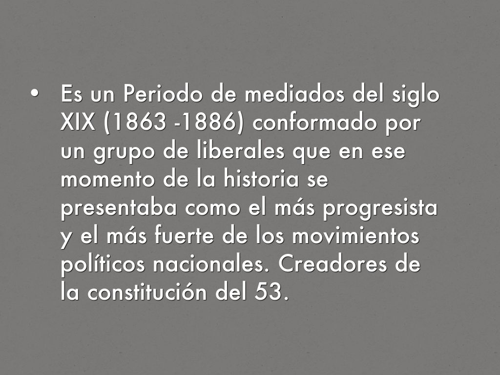 - Es un Periodo de mediados del siglo XIX (1863 -1886) conformado por un grupo de liberales que en ese momento de la historia se presentaba como el más progresista y el más fuerte de los movimientos políticos nacionales. Creadores de la constitución del 53.