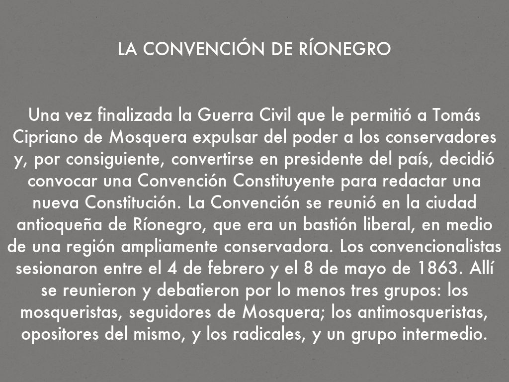 Una vez finalizada la Guerra Civil que le permitió a Tomás Cipriano de Mosquera expulsar del poder a los conservadores y, por consiguiente, convertirse en presidente del país, decidió convocar una Convención Constituyente para redactar una nueva Constitución. La Convención se reunió en la ciudad antioqueña de Ríonegro, que era un bastión liberal, en medio de una región ampliamente conservadora. Los convencionalistas sesionaron entre el 4 de febrero y el 8 de mayo de 1863. Allí se reunieron y debatieron por lo menos tres grupos: los mosqueristas, seguidores de Mosquera; los antimosqueristas, opositores del mismo, y los radicales, y un grupo intermedio.
