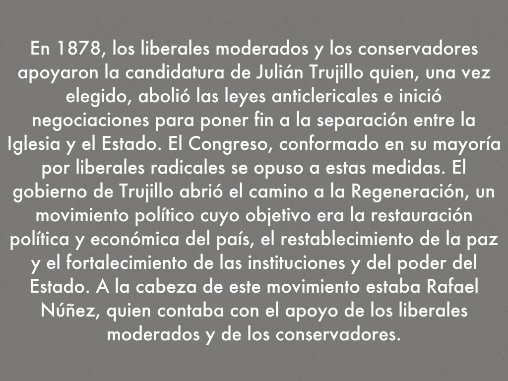 En 1878, los liberales moderados y los conservadores apoyaron la candidatura de Julián Trujillo quien, una vez elegido, abolió las leyes anticlericales e inició negociaciones para poner fin a la separación entre la Iglesia y el Estado. El Congreso, conformado en su mayoría por liberales radicales se opuso a estas medidas. El gobierno de Trujillo abrió el camino a la Regeneración, un movimiento político cuyo objetivo era la restauración política y económica del país, el restablecimiento de la paz y el fortalecimiento de las instituciones y del poder del Estado. A la cabeza de este movimiento estaba Rafael Núñez, quien contaba con el apoyo de los liberales moderados y de los conservadores.