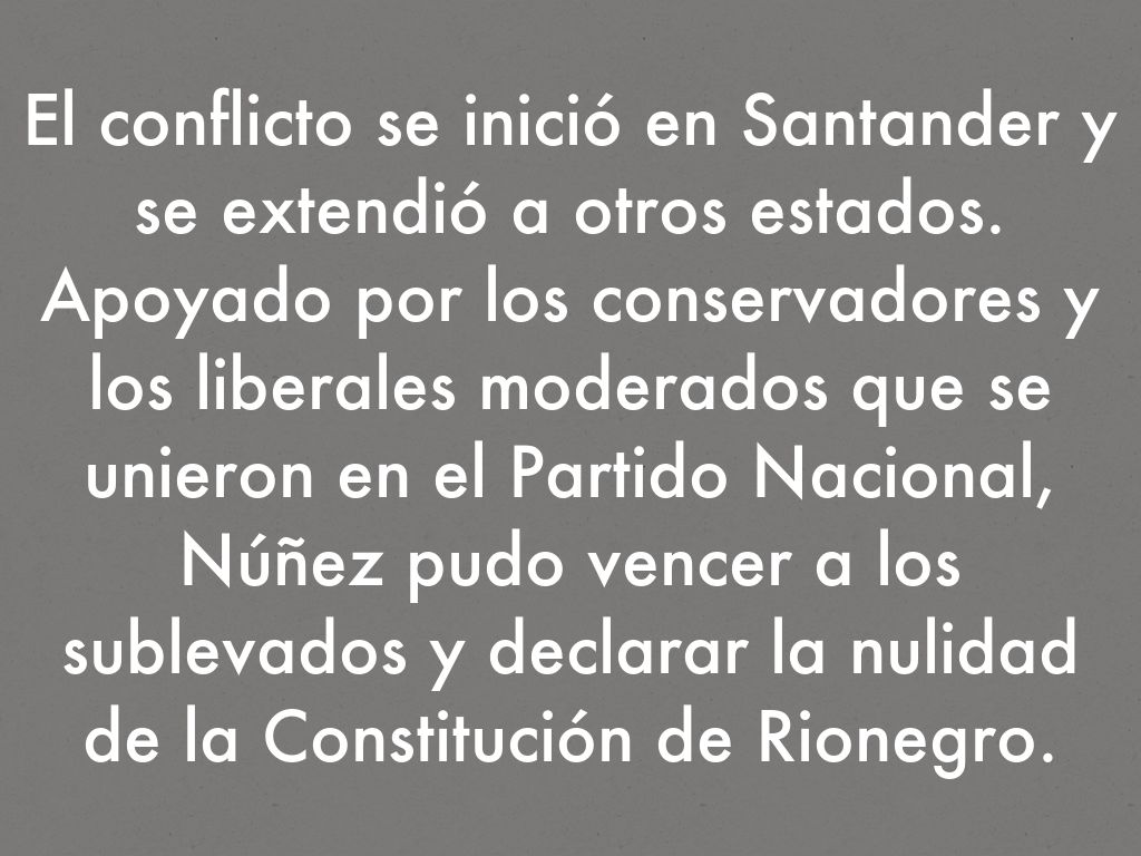 El conflicto se inició en Santander y se extendió a otros estados. Apoyado por los conservadores y los liberales moderados que se unieron en el Partido Nacional, Núñez pudo vencer a los sublevados y declarar la nulidad de la Constitución de Rionegro.