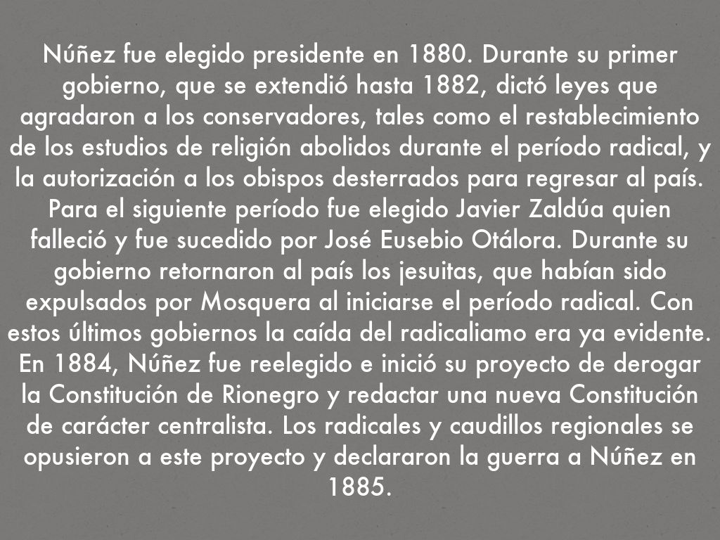 Núñez fue elegido presidente en 1880. Durante su primer gobierno, que se extendió hasta 1882, dictó leyes que agradaron a los conservadores, tales como el restablecimiento de los estudios de religión abolidos durante el período radical, y la autorización a los obispos desterrados para regresar al país. Para el siguiente período fue elegido Javier Zaldúa quien falleció y fue sucedido por José Eusebio Otálora. Durante su gobierno retornaron al país los jesuitas, que habían sido expulsados por Mosquera al iniciarse el período radical. Con estos últimos gobiernos la caída del radicaliamo era ya evidente. En 1884, Núñez fue reelegido e inició su proyecto de derogar la Constitución de Rionegro y redactar una nueva Constitución de carácter centralista. Los radicales y caudillos regionales se opusieron a este proyecto y declararon la guerra a Núñez en 1885.