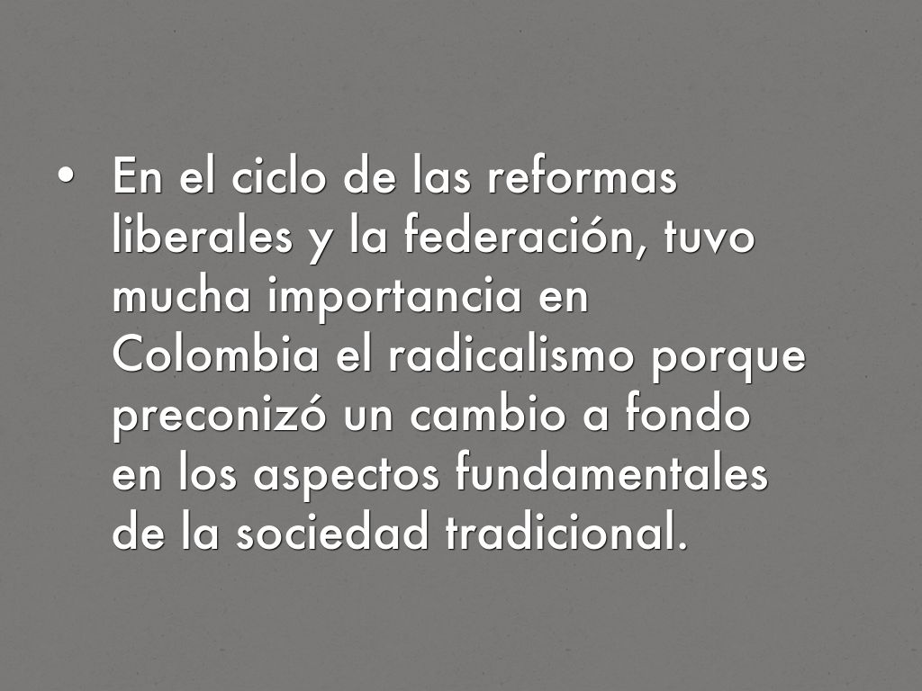 - En el ciclo de las reformas liberales y la federación, tuvo mucha importancia en Colombia el radicalismo porque preconizó un cambio a fondo en los aspectos fundamentales de la sociedad tradicional.