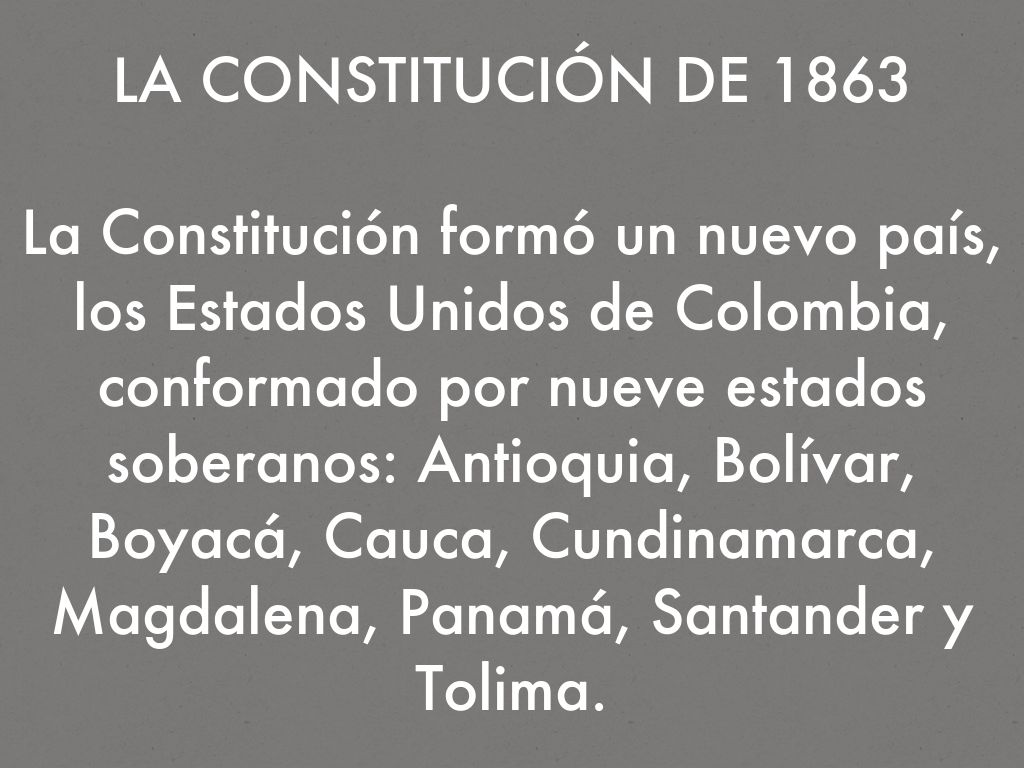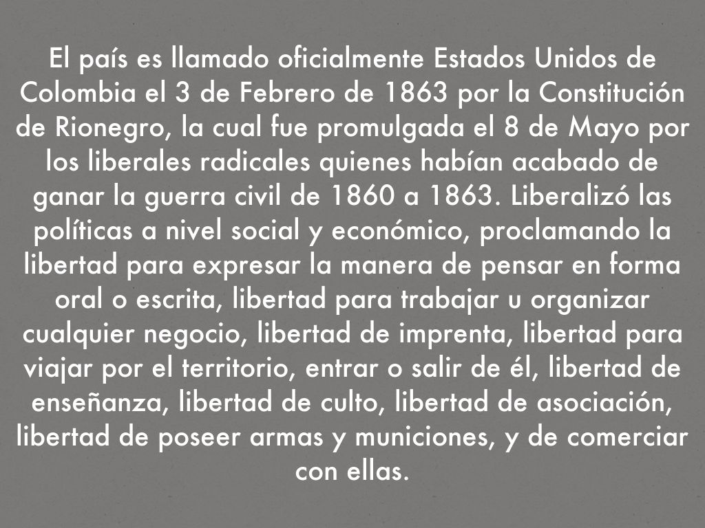 El país es llamado oficialmente Estados Unidos de Colombia el 3 de Febrero de 1863 por la Constitución de Rionegro, la cual fue promulgada el 8 de Mayo por los liberales radicales quienes habían acabado de ganar la guerra civil de 1860 a 1863. Liberalizó las políticas a nivel social y económico, proclamando la libertad para expresar la manera de pensar en forma oral o escrita, libertad para trabajar u organizar cualquier negocio, libertad de imprenta, libertad para viajar por el territorio, entrar o salir de él, libertad de enseñanza, libertad de culto, libertad de asociación, libertad de poseer armas y municiones, y de comerciar con ellas.