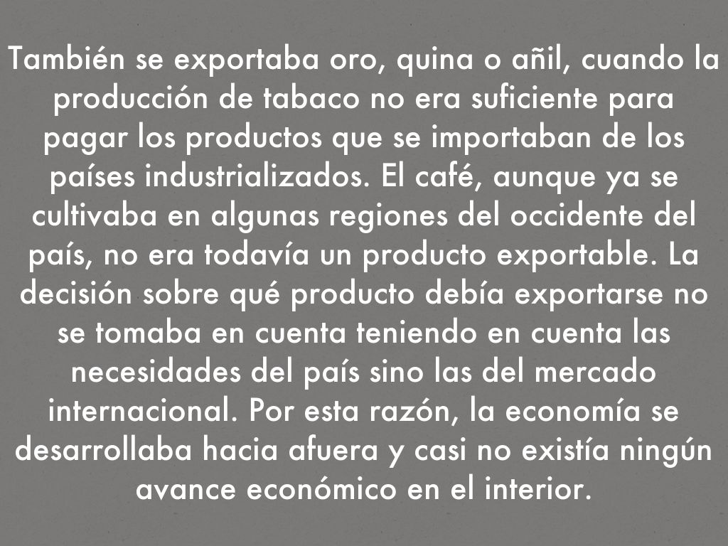 También se exportaba oro, quina o añil, cuando la producción de tabaco no era suficiente para pagar los productos que se importaban de los países industrializados. El café, aunque ya se cultivaba en algunas regiones del occidente del país, no era todavía un producto exportable. La decisión sobre qué producto debía exportarse no se tomaba en cuenta teniendo en cuenta las necesidades del país sino las del mercado internacional. Por esta razón, la economía se desarrollaba hacia afuera y casi no existía ningún avance económico en el interior.