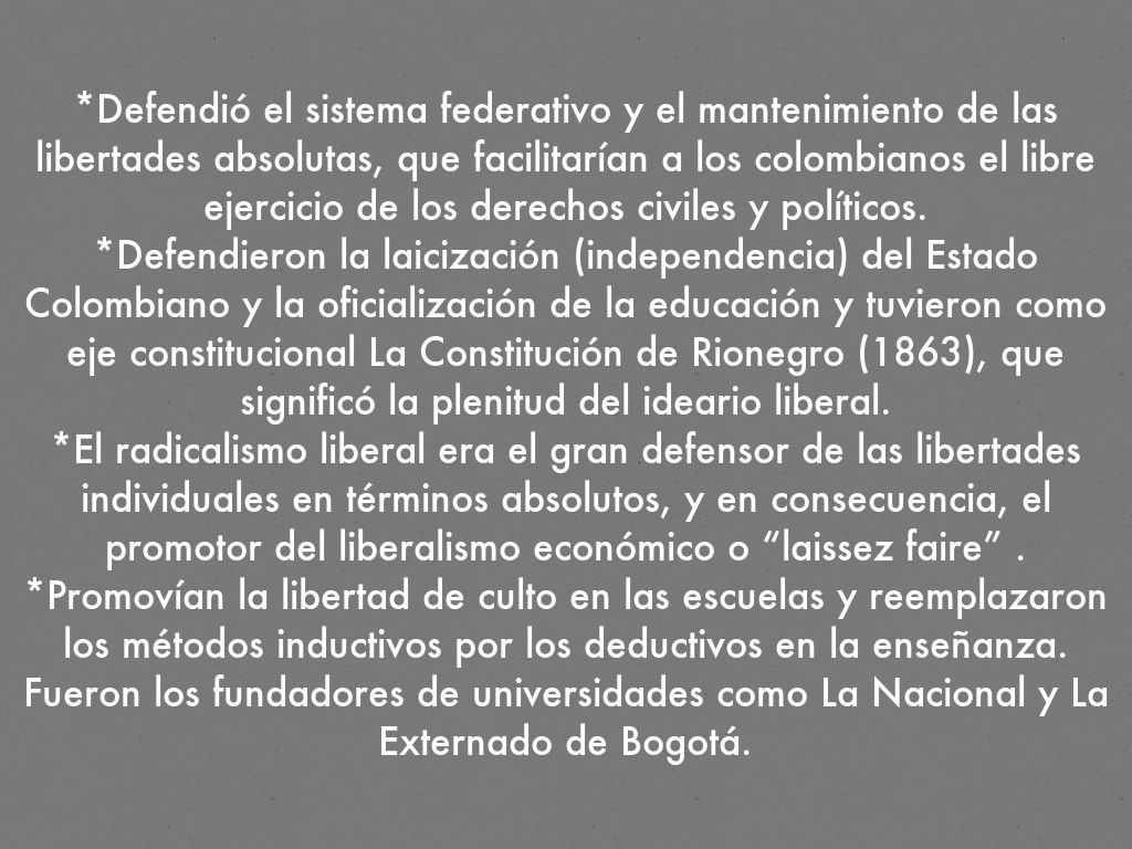 *Defendieron la laicización (independencia) del Estado Colombiano y la oficialización de la educación y tuvieron como eje constitucional La Constitución de Rionegro (1863), que significó la plenitud del ideario liberal.