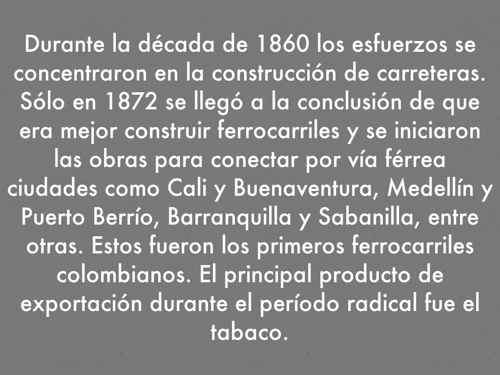 Durante la década de 1860 los esfuerzos se concentraron en la construcción de carreteras. Sólo en 1872 se llegó a la conclusión de que era mejor construir ferrocarriles y se iniciaron las obras para conectar por vía férrea ciudades como Cali y Buenaventura, Medellín y Puerto Berrío, Barranquilla y Sabanilla, entre otras. Estos fueron los primeros ferrocarriles colombianos. El principal producto de exportación durante el período radical fue el tabaco.
