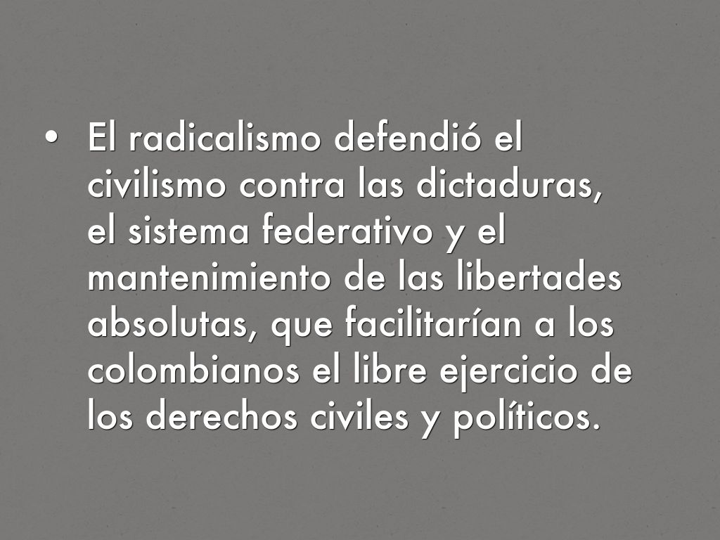 - El radicalismo defendió el civilismo contra las dictaduras, el sistema federativo y el mantenimiento de las libertades absolutas, que facilitarían a los colombianos el libre ejercicio de los derechos civiles y políticos.