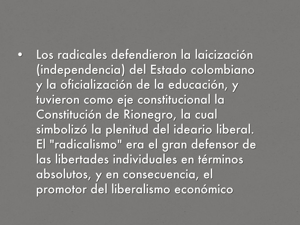 - Los radicales defendieron la laicización (independencia) del Estado colombiano y la oficialización de la educación, y tuvieron como eje constitucional la Constitución de Rionegro, la cual simbolizó la plenitud del ideario liberal. El "radicalismo" era el gran defensor de las libertades individuales en términos absolutos, y en consecuencia, el promotor del liberalismo económico