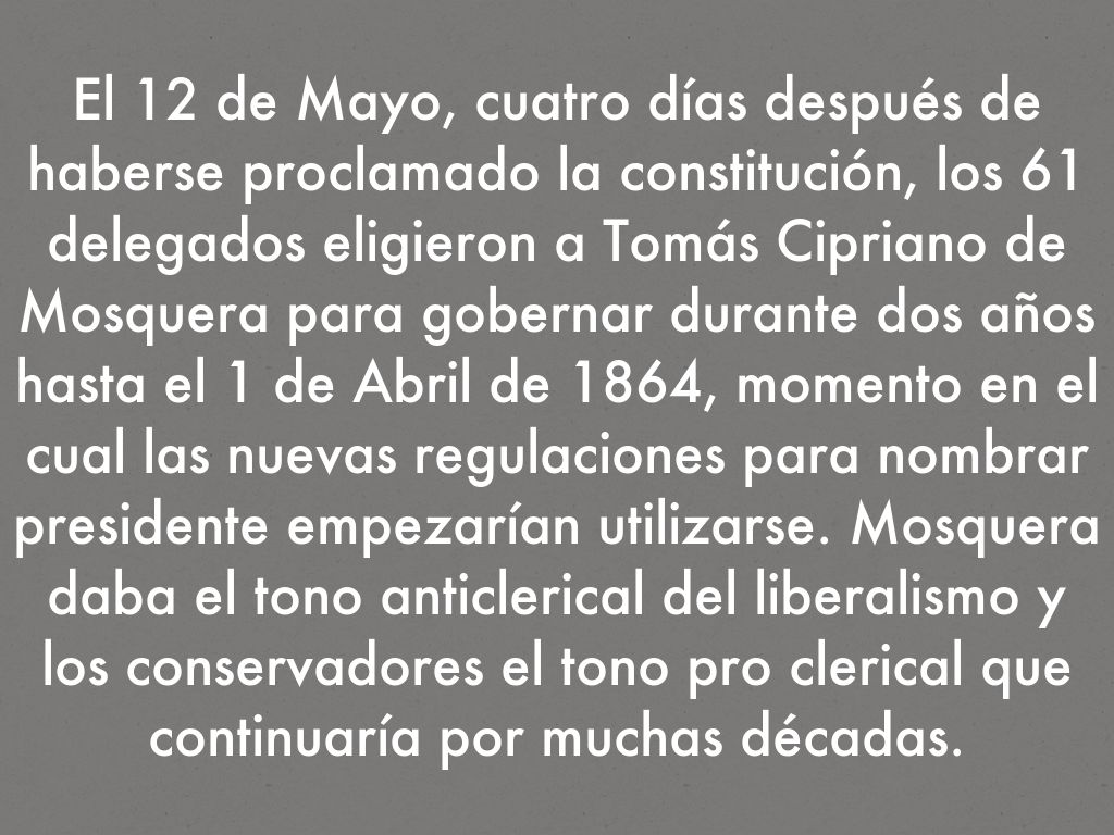 El 12 de Mayo, cuatro días después de haberse proclamado la constitución, los 61 delegados eligieron a Tomás Cipriano de Mosquera para gobernar durante dos años hasta el 1 de Abril de 1864, momento en el cual las nuevas regulaciones para nombrar presidente empezarían utilizarse. Mosquera daba el tono anticlerical del liberalismo y los conservadores el tono pro clerical que continuaría por muchas décadas.