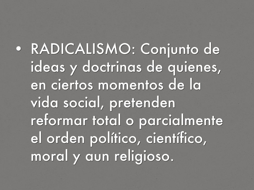 - RADICALISMO: Conjunto de ideas y doctrinas de quienes, en ciertos momentos de la vida social, pretenden reformar total o parcialmente el orden político, científico, moral y aun religioso.