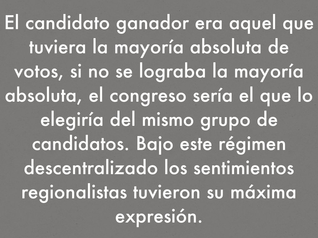 El candidato ganador era aquel que tuviera la mayoría absoluta de votos, si no se lograba la mayoría absoluta, el congreso sería el que lo elegiría del mismo grupo de candidatos. Bajo este régimen descentralizado los sentimientos regionalistas tuvieron su máxima expresión.
