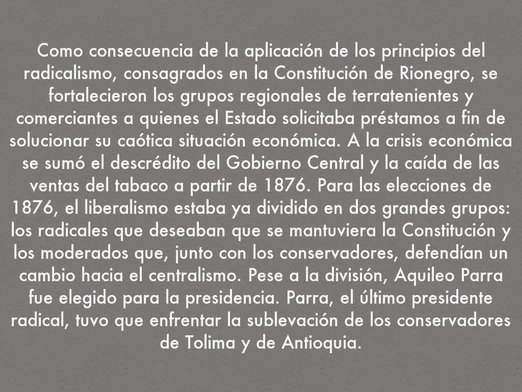Como consecuencia de la aplicación de los principios del radicalismo, consagrados en la Constitución de Rionegro, se fortalecieron los grupos regionales de terratenientes y comerciantes a quienes el Estado solicitaba préstamos a fin de solucionar su caótica situación económica. A la crisis económica se sumó el descrédito del Gobierno Central y la caída de las ventas del tabaco a partir de 1876. Para las elecciones de 1876, el liberalismo estaba ya dividido en dos grandes grupos: los radicales que deseaban que se mantuviera la Constitución y los moderados que, junto con los conservadores, defendían un cambio hacia el centralismo. Pese a la división, Aquileo Parra fue elegido para la presidencia. Parra, el último presidente radical, tuvo que enfrentar la sublevación de los conservadores de Tolima y de Antioquia.