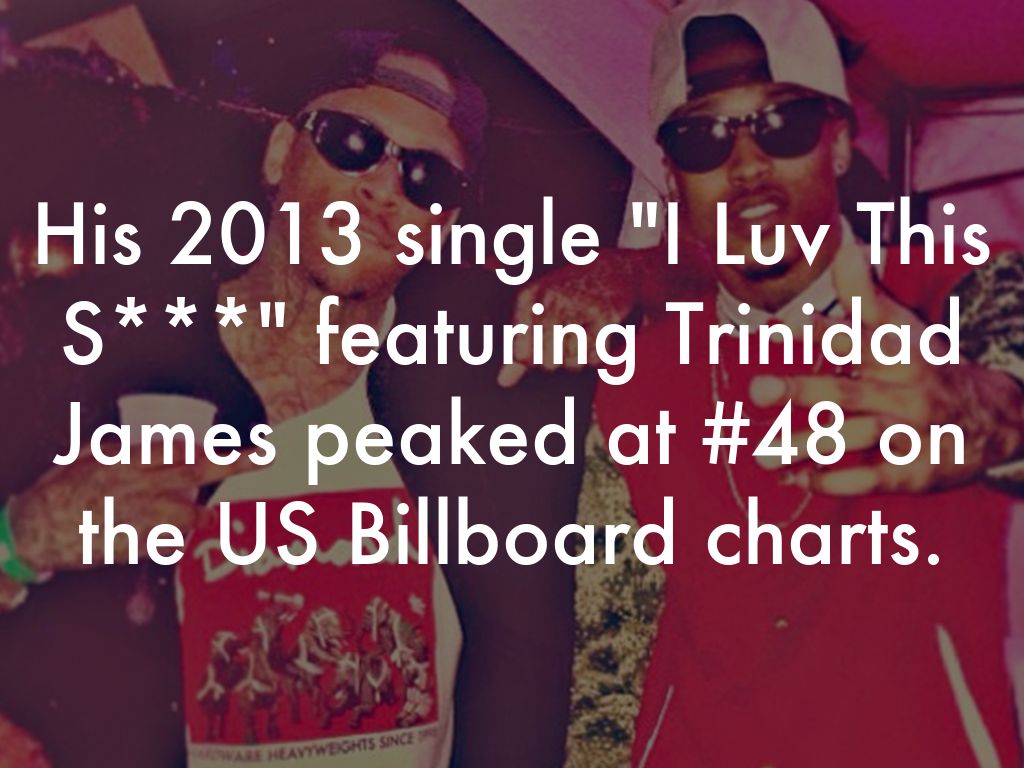 His 2013 single "I Luv This S***" featuring Trinidad James peaked at #48 on the US Billboard charts.