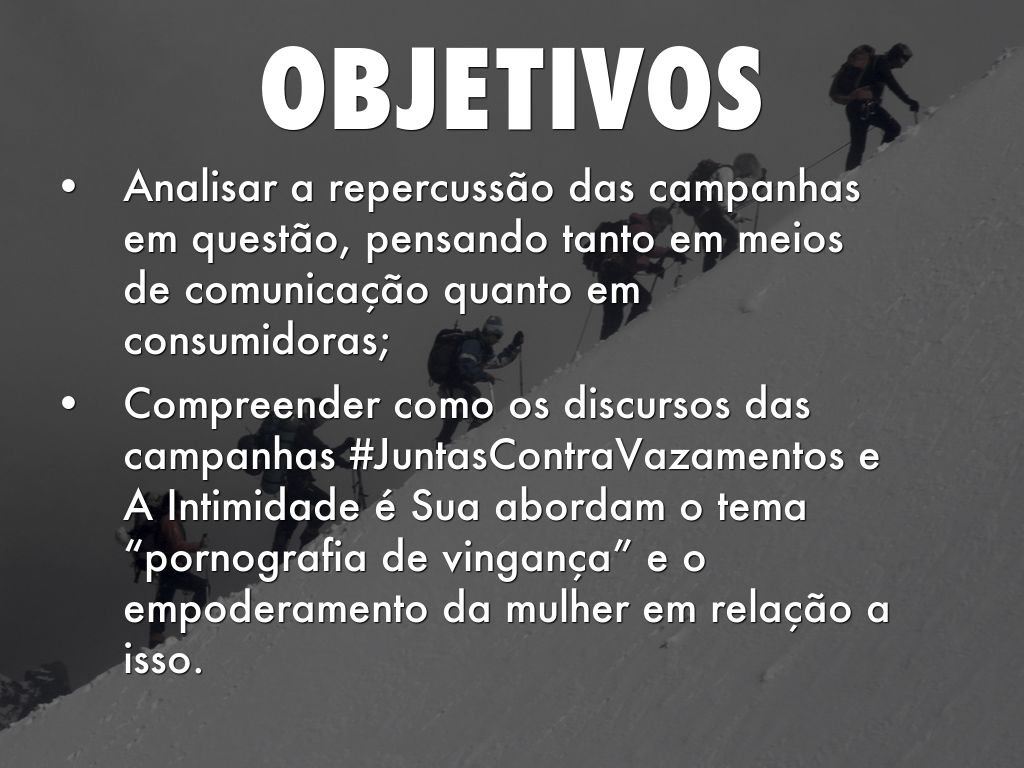 • Compreender como os discursos das campanhas #JuntasContraVazamentos e A Intimidade é Sua abordam o tema “pornografia de vingança” e o empoderamento da mulher em relação a isso.
