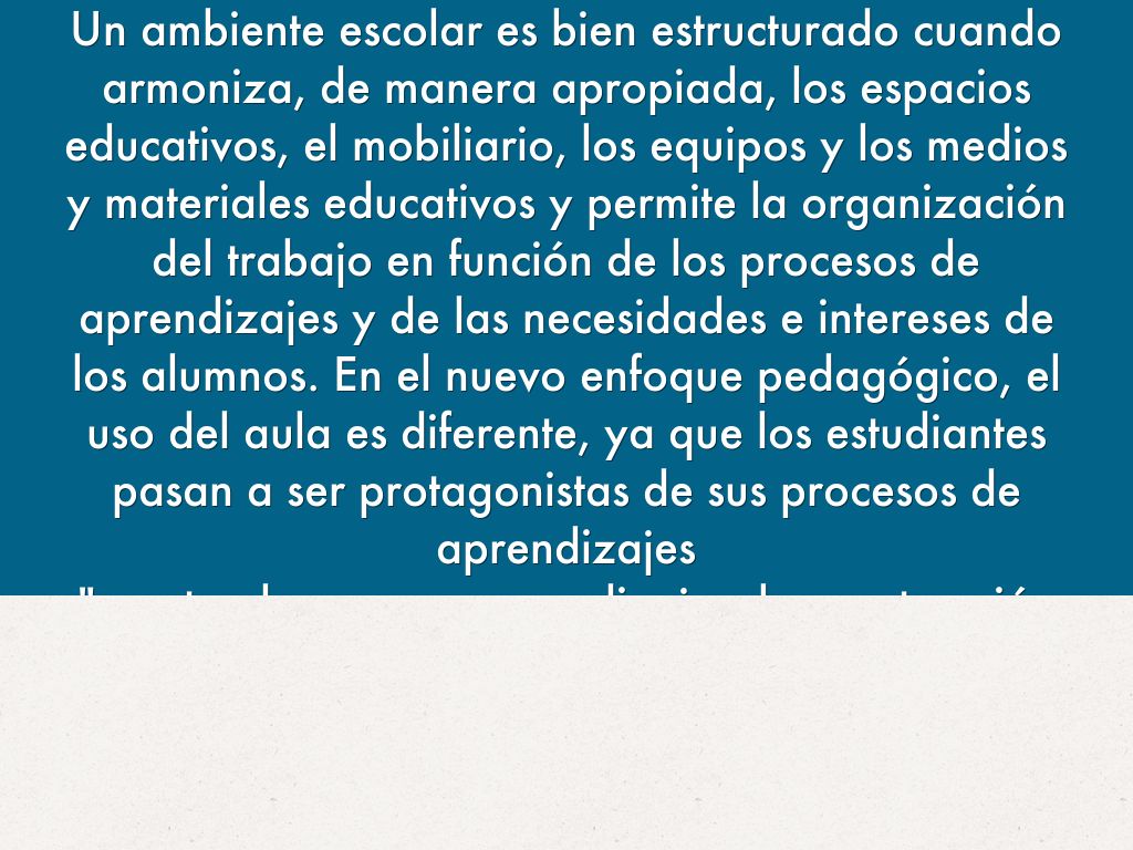 Un ambiente escolar es bien estructurado cuando armoniza, de manera apropiada, los espacios educativos, el mobiliario, los equipos y los medios y materiales educativos y permite la organización del trabajo en función de los procesos de aprendizajes y de las necesidades e intereses de los alumnos. En el nuevo enfoque pedagógico, el uso del aula es diferente, ya que los estudiantes pasan a ser protagonistas de sus procesos de aprendizajes