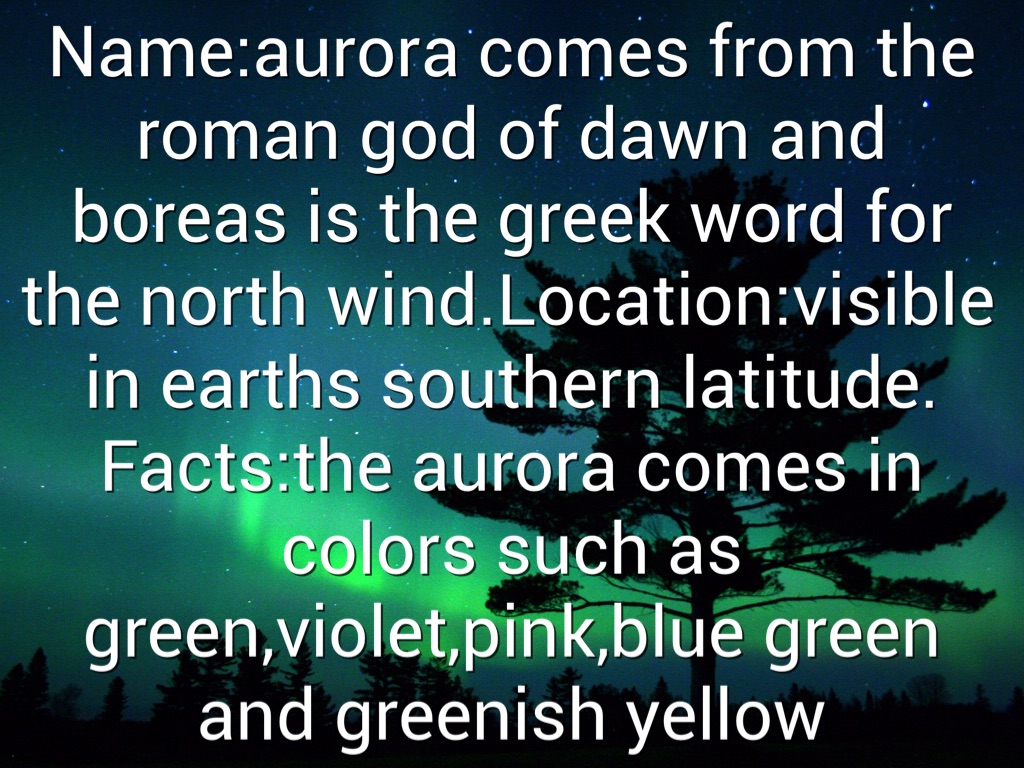 Name:aurora comes from the roman god of dawn and boreas is the greek word for the north wind.Location:visible in earths southern latitude. Facts:the aurora comes in colors such as green,violet,pink,blue green and greenish yellow