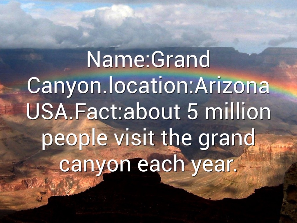 Name:Grand Canyon.location:Arizona USA.Fact:about 5 million people visit the grand canyon each year.