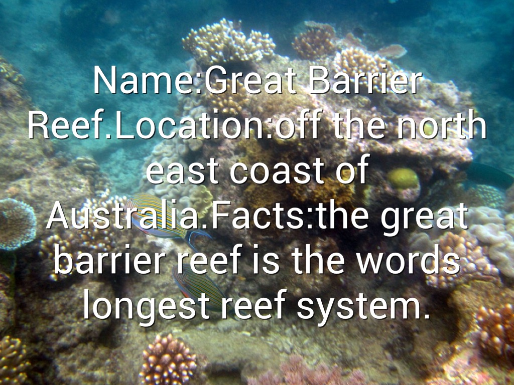 Name:Great Barrier Reef.Location:off the north east coast of Australia.Facts:the great barrier reef is the words longest reef system.