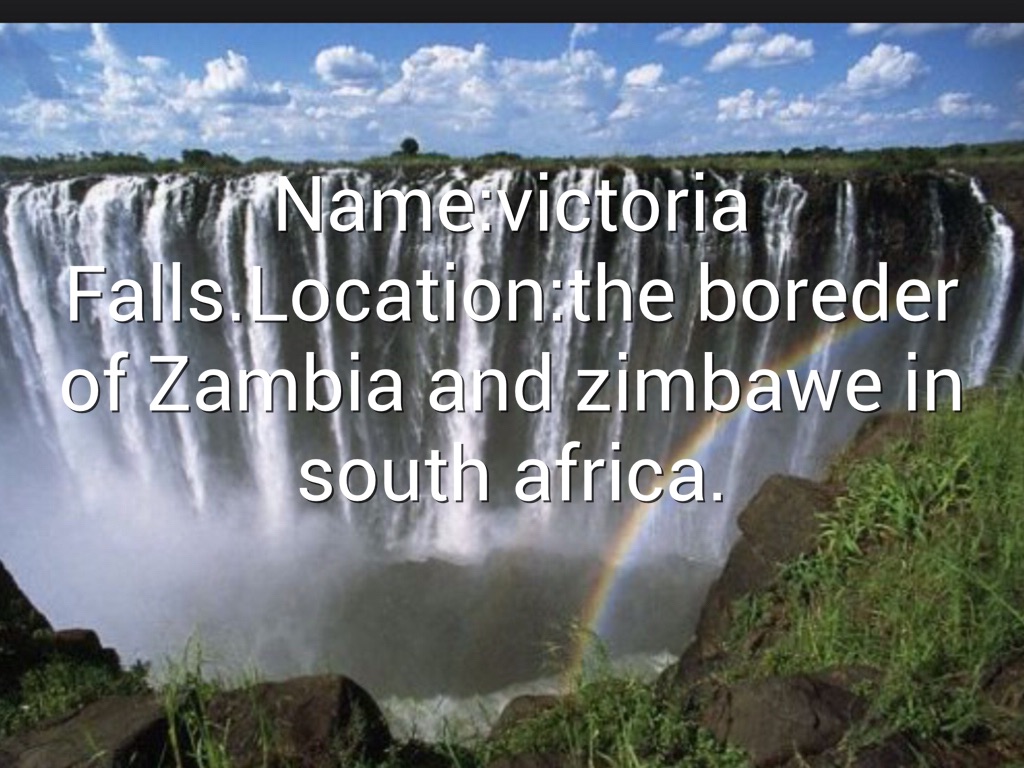 Name:victoria Falls.Location:the boreder of Zambia and zimbawe in south africa.