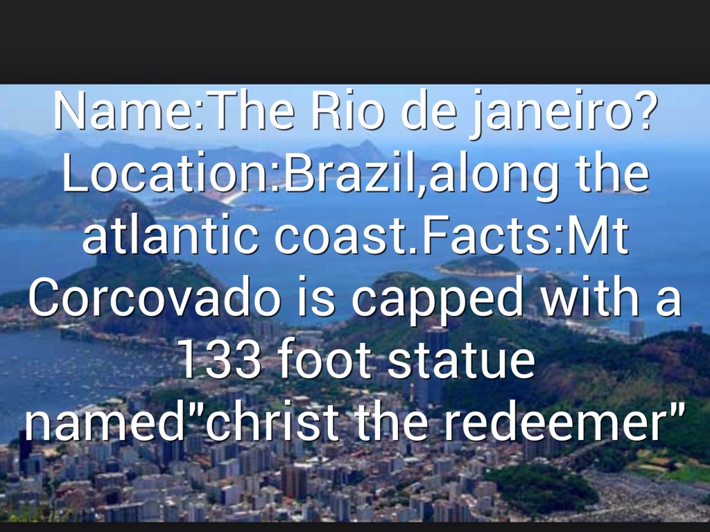 Name:The Rio de janeiro?Location:Brazil,along the atlantic coast.Facts:Mt Corcovado is capped with a 133 foot statue named"christ the redeemer"