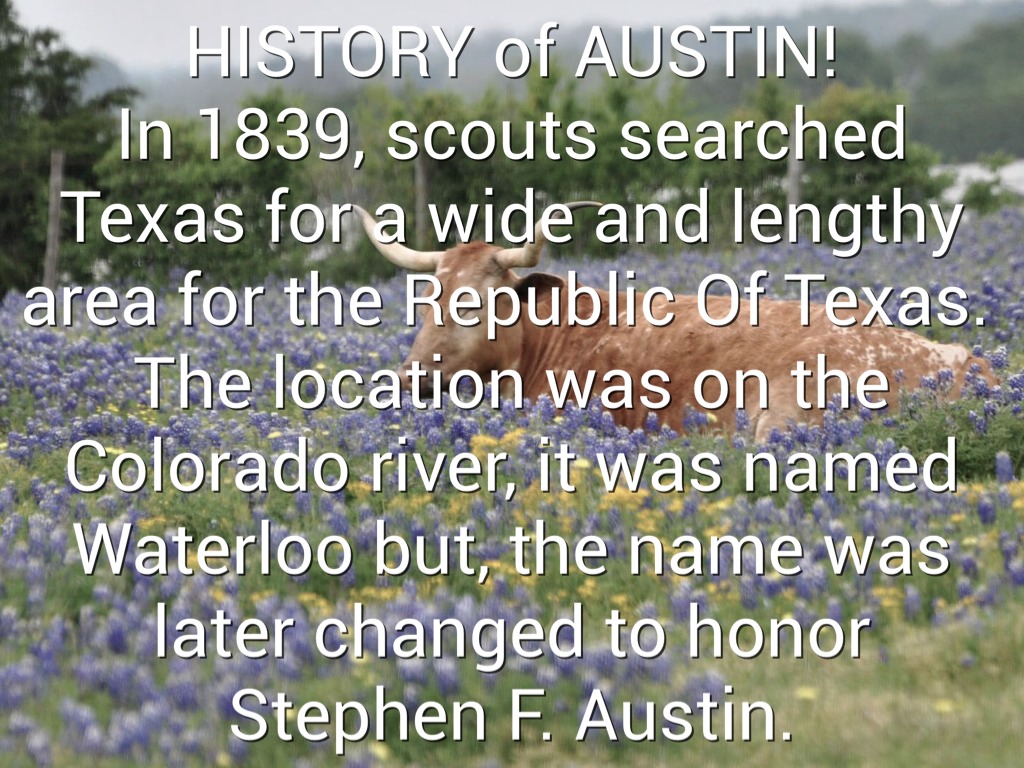 HISTORY of AUSTIN! In 1839, scouts searched Texas for a wide and lengthy area for the Republic Of Texas. The location was on the Colorado river, it was named Waterloo but, the name was later changed to honor Stephen F. Austin.