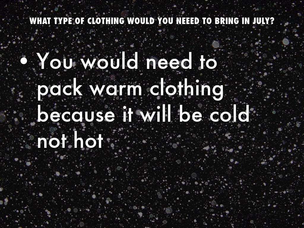 WHAT TYPE OF CLOTHING WOULD YOU NEEED TO BRING IN JULY?
