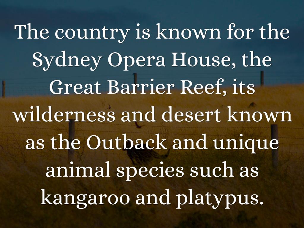 The country is known for the Sydney Opera House, the Great Barrier Reef, its wilderness and desert known as the Outback and unique animal species such as kangaroo and platypus.