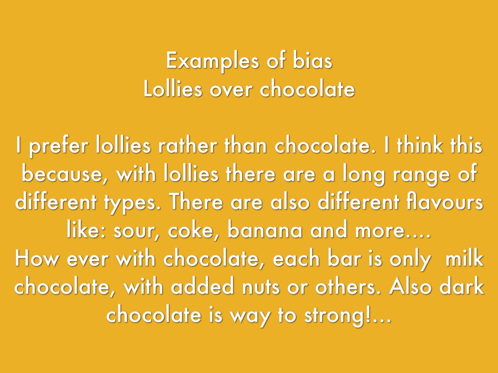 I prefer lollies rather than chocolate. I think this because, with lollies there are a long range of different types. There are also different flavours like: sour, coke, banana and more....