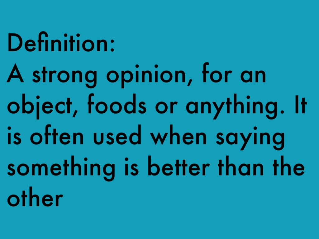A strong opinion, for an object, foods or anything. It is often used when saying something is better than the other